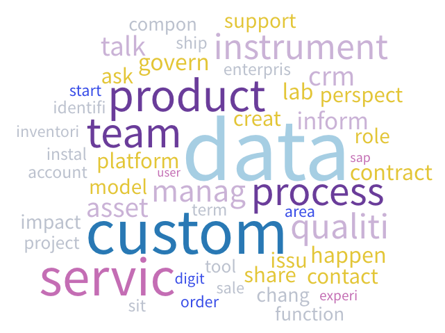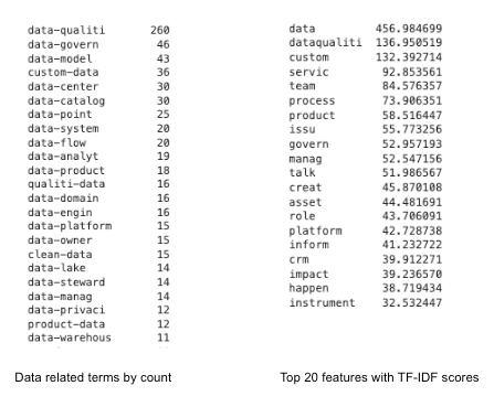 From the top 10 counts (stemmed) we see that data-quality is, by far, the biggest concern. Data-governance is the next area we’d want to address. One that stands out is customer-data. Part of their product is data itself, but this suggests there is a separate set that needs attention as well, and that is the internal data about their clients.