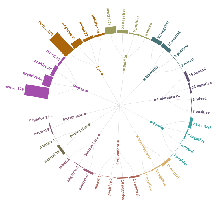 Mostly, we were interested to see the sentiment surrounding some of the critical data elements that will be used in a possible data modeling solution. The sentiment wheel below gives a quick overview, starting with the most mentioned term ‘ ship to’ and moving clockwise to the least mentioned ‘instrument ‘.
