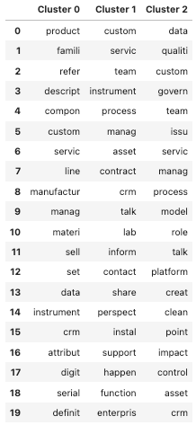Looking at the top features in each cluster points us in the right direction to focus our efforts. It is clear that the client’s priorities are their data and how to manage it, the handling of their customers’ accounts, and their product.